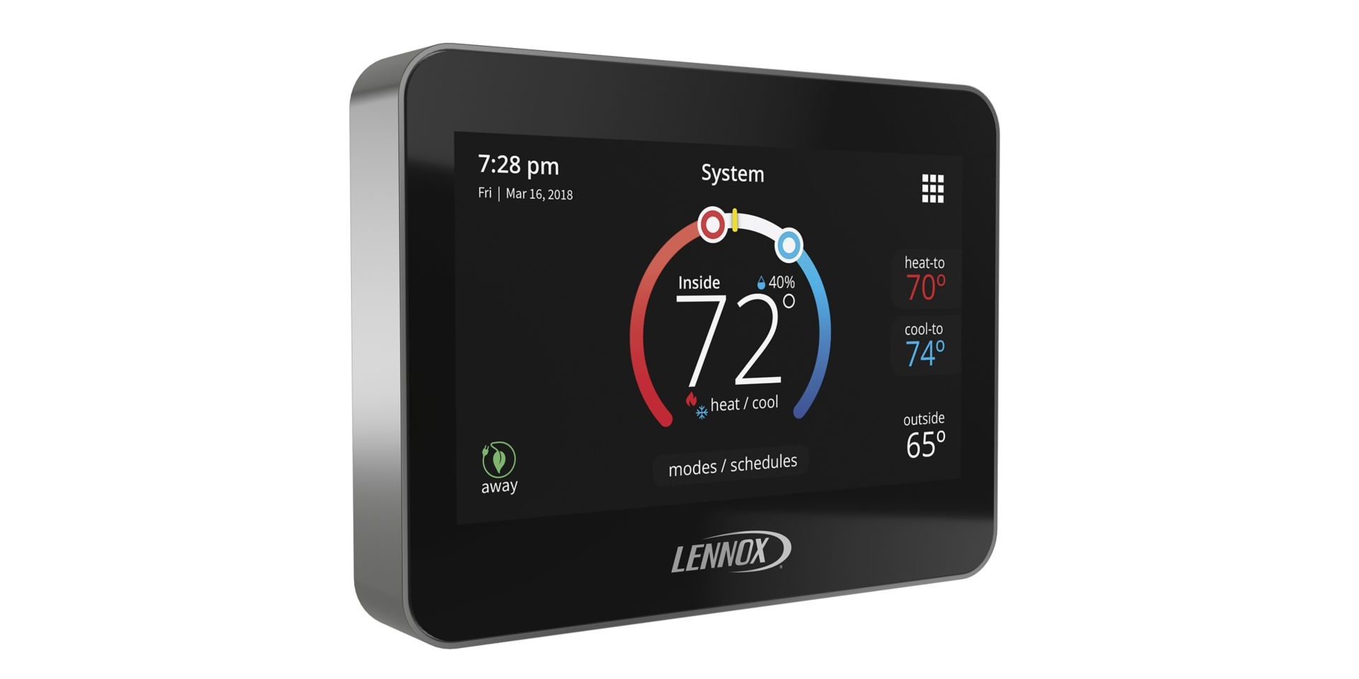 - Smart Away™ Mode: Uses the location services in your smartphone to detect when you’re leaving, and automatically changes the temperature to a more energy-efficient setting.
