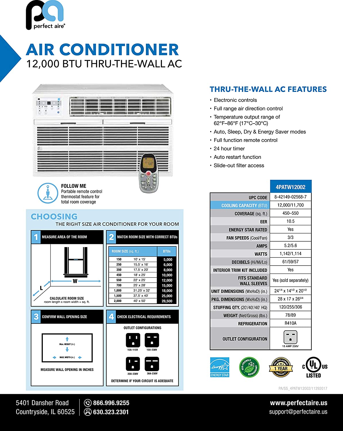 Perfect Aire 4PATW12002 EER 10.5 Thru-The-Wall Air Conditioner with Remote Control, 450-550 sq. ft.